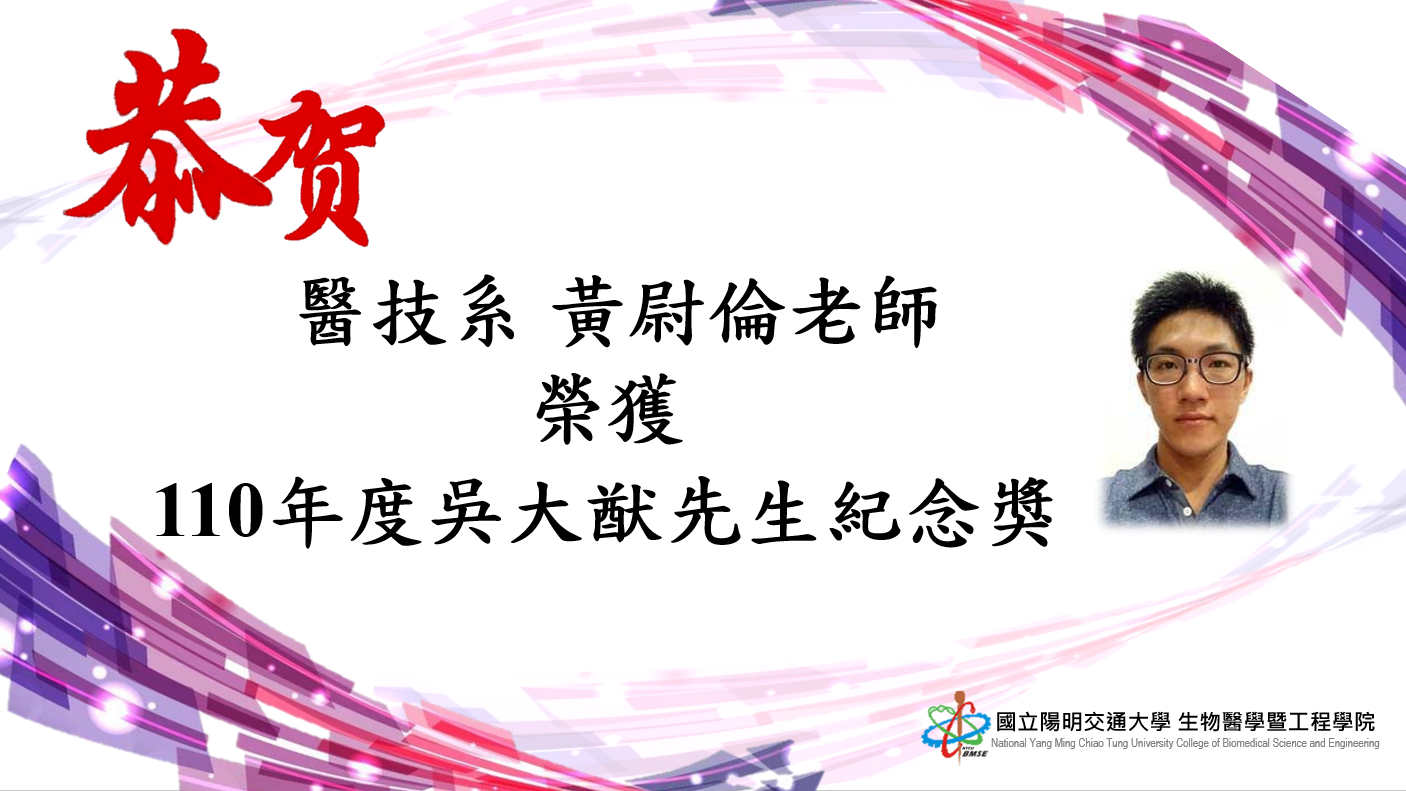 恭喜醫技系黃尉倫老師榮獲110年度吳大猷先生紀念獎